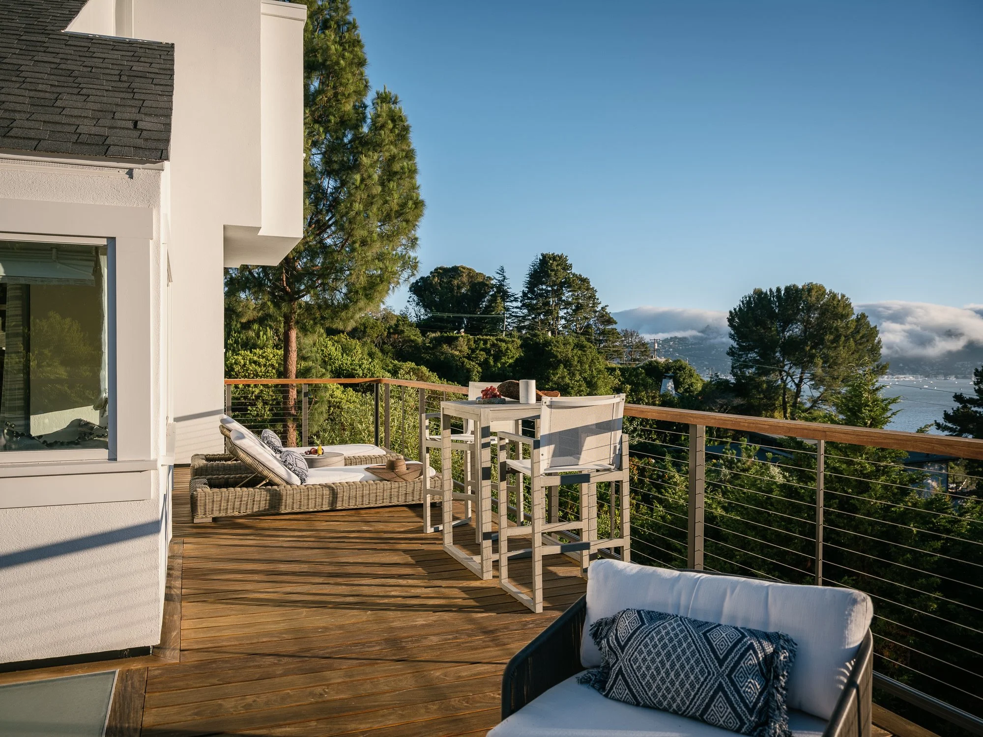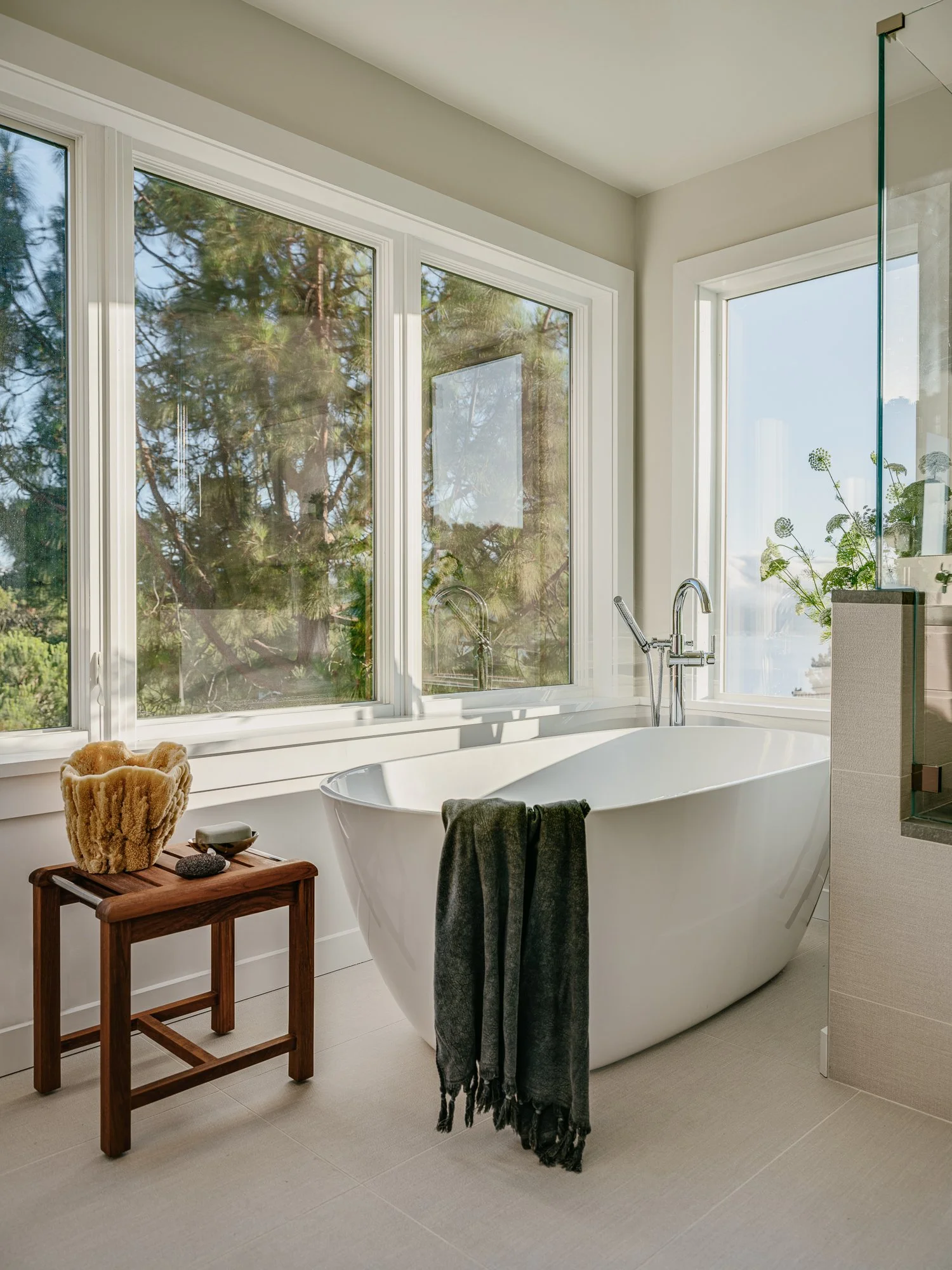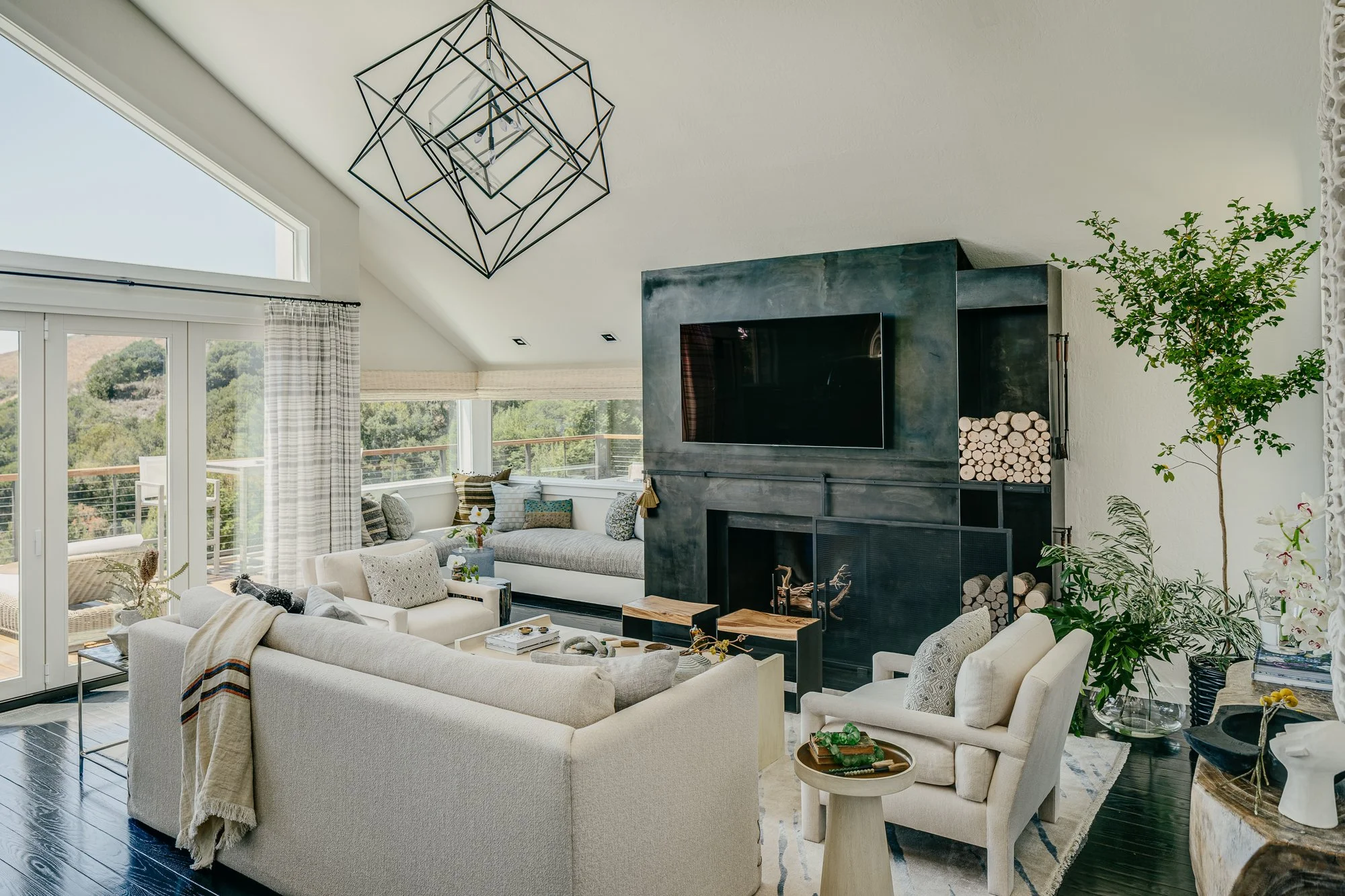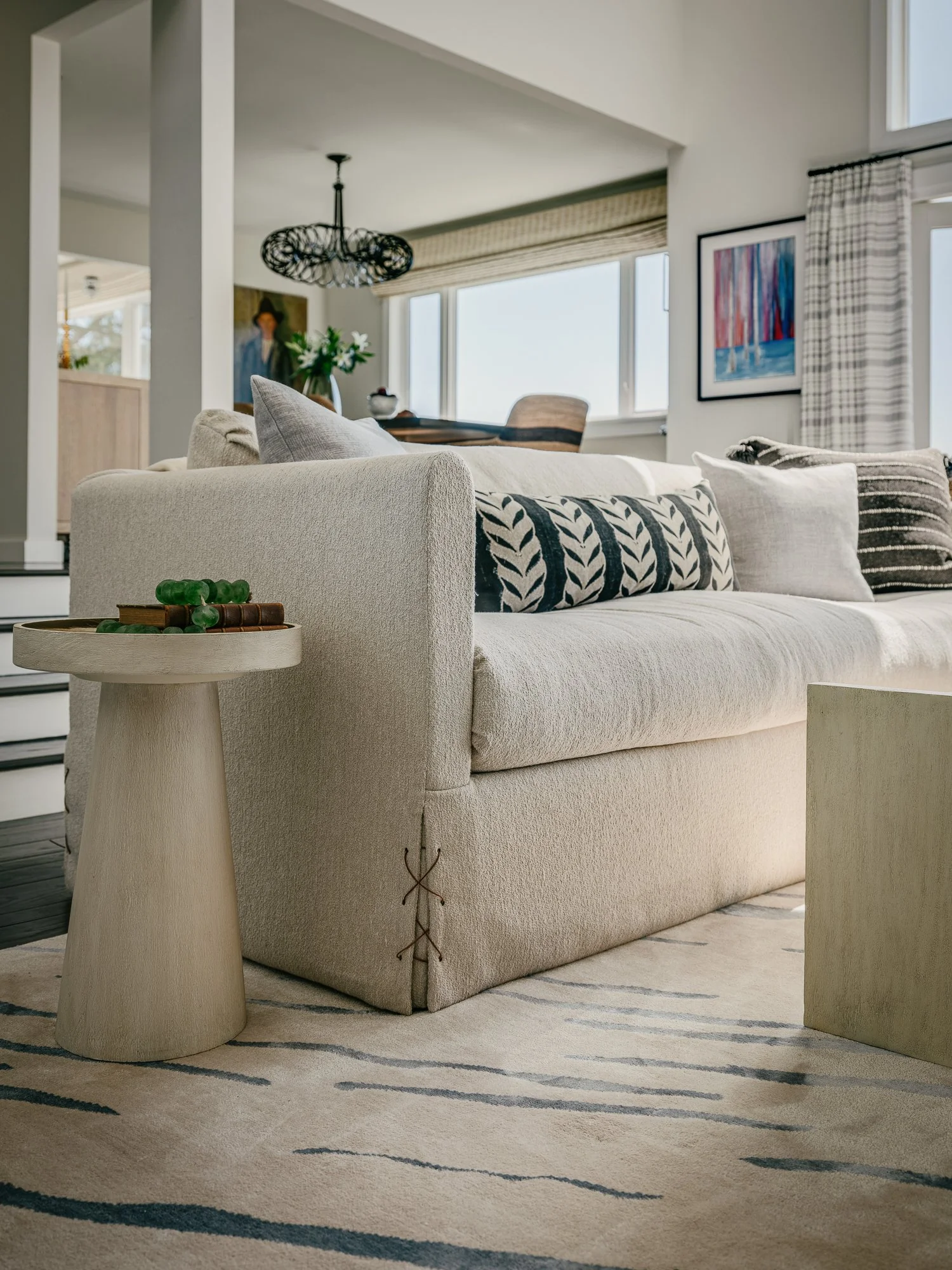 Bespoke couch, pillows, and drapery add luxury with every touch